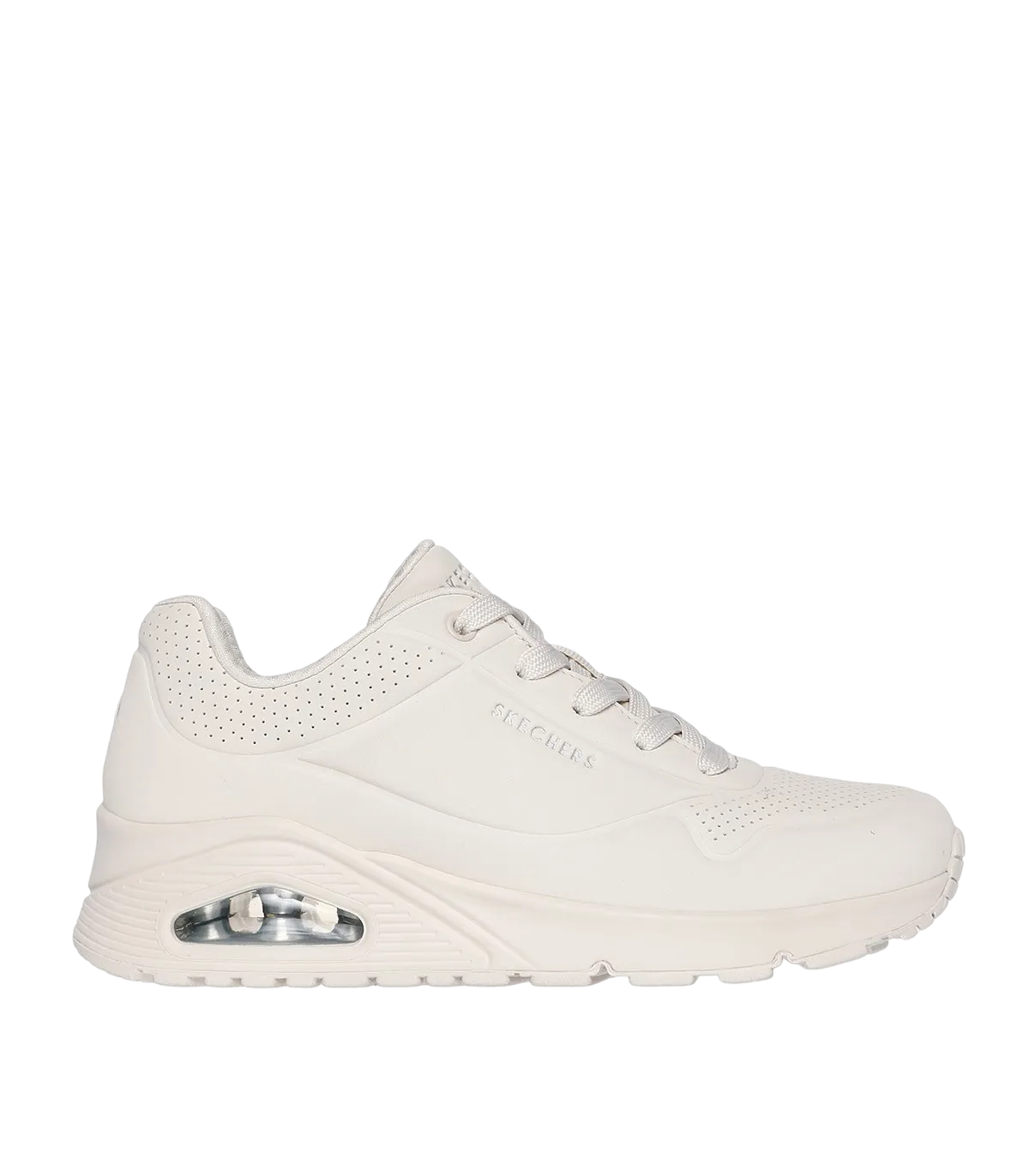 La comodidad de un modelo clásico con cámara de aire se actualiza con la Skechers Street™ Uno – Stand on Air. Moderno modelo con cordones con parte superior de piel sintética lisa y perforada, una plantilla Skechers Air-Cooled Memory Foam™ y mediasuela con cámara de aire visible Skech-Air.